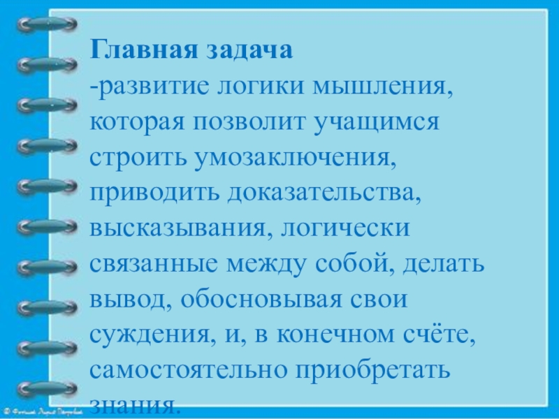 высказывания, логически связанные между собой, делать вывод, обосновывая свои суждения, и, в конечном счёте, самостоятельно приобретать знания.