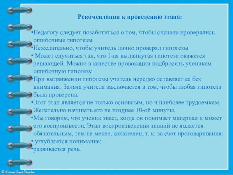При выдвижении гипотезы учитель нередко оставляет ее без внимания. Задача учителя заключается в том, чтобы любая гипотеза была проверена.