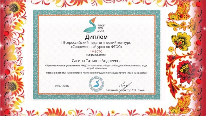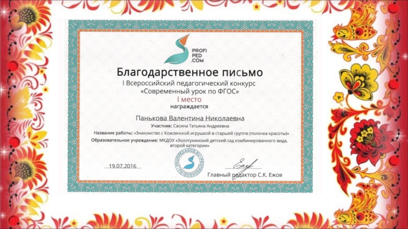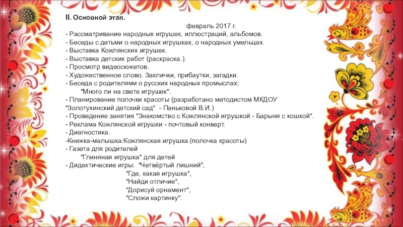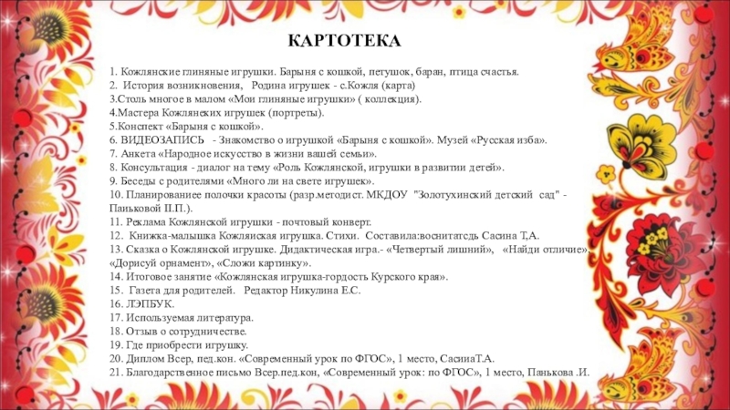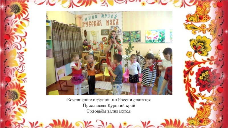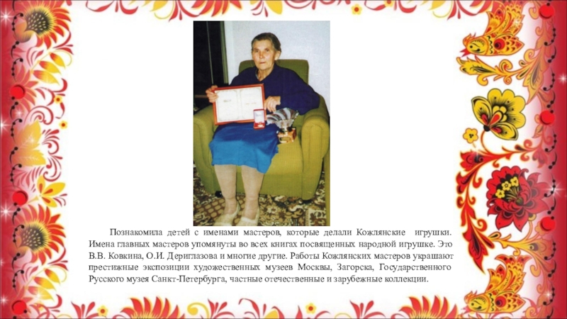 Слайд 12 Познакомила детей с именами мастеров, которые делали Кожлянские игрушки. Имена главных
