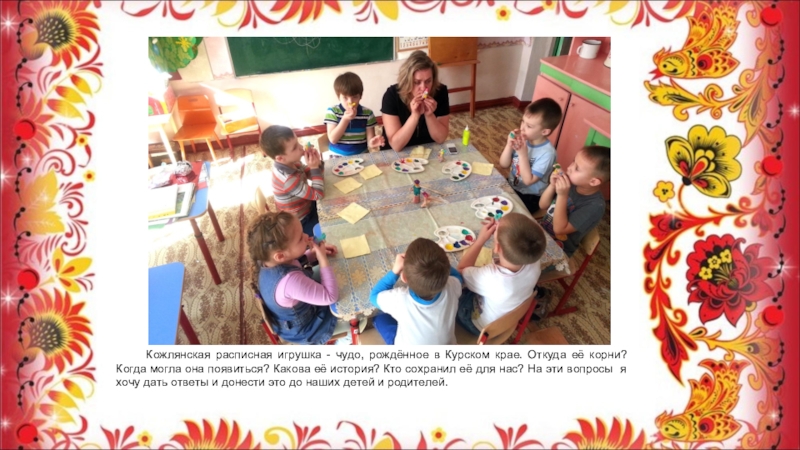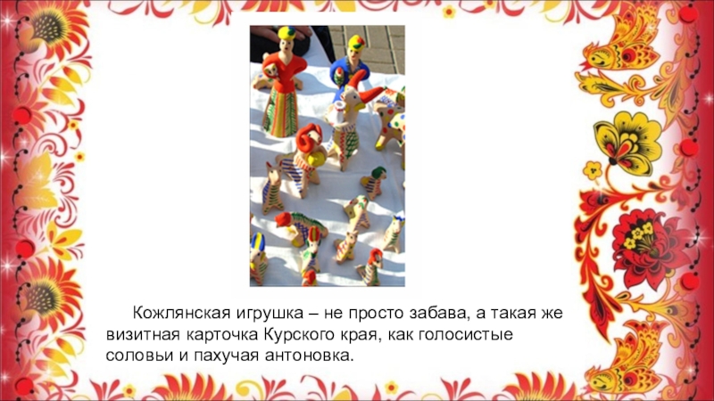 Слайд 3 Кожлянская расписная игрушка - чудо, рождённое в Курском крае. Откуда её