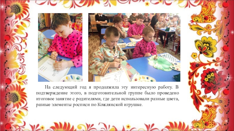в подготовительной группе было проведено итоговое занятие с родителями, где дети использовали разные цвета, разные элементы росписи по Кожлянской игрушке.