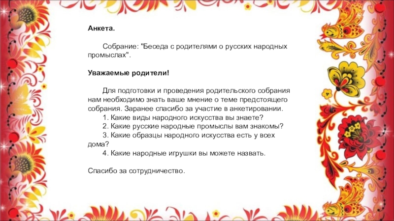- Беседа с родителями о русских народных промыслах: