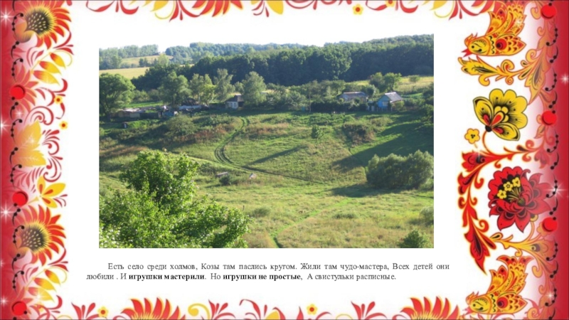 Слайд 11 Есть село среди холмов, Козы там паслись кругом. Жили там чудо-мастера,