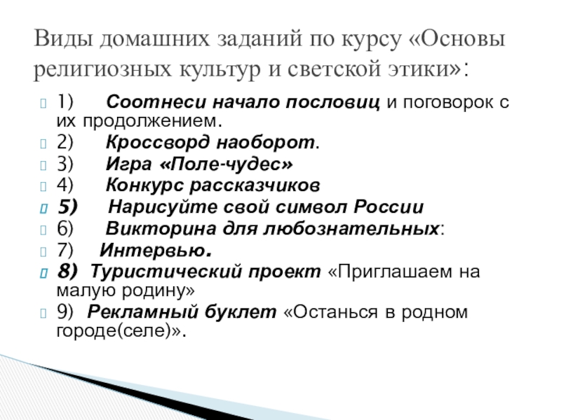 Виды домашних заданий по курсу «Основы религиозных культур и светской этики»: