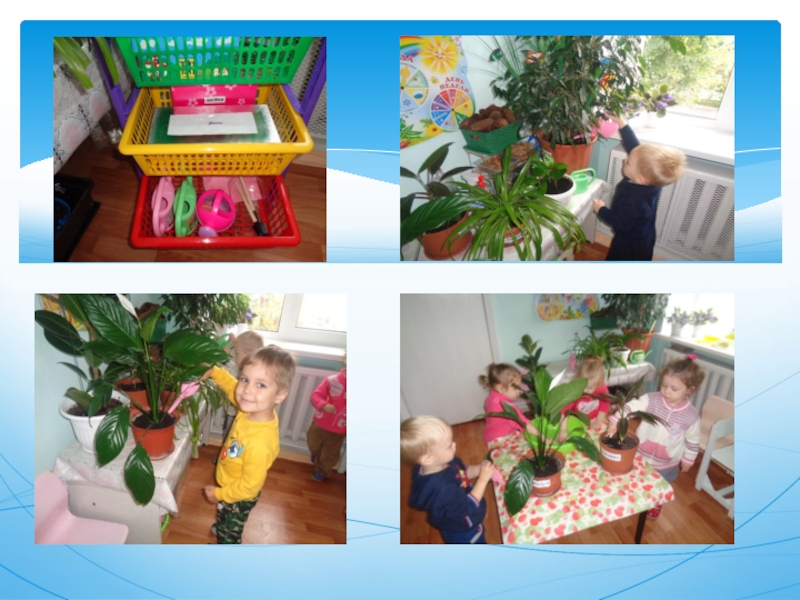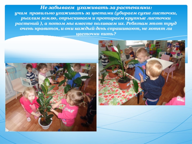 листочки, рыхлим землю, опрыскиваем и протираем крупные листочки растений ), а потом мы вместе поливаем их. Ребятам этот труд очень нравится, и они каждый день спрашивают, не хотят ли цветочки пить?