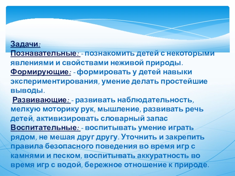Познавательные: - познакомить детей с некоторыми явлениями и свойствами неживой