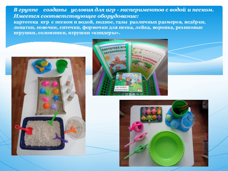 картотека игр с песком и водой, поднос, тазы различных размеров, ведёрки, лопатки, совочки, ситечки, формочки для песка, лейка, воронка, резиновые игрушки, соломинки, игрушки «киндеры».