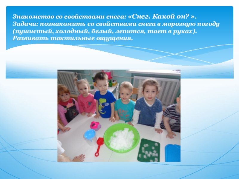 Слайд 10Знакомство со свойствами снега: «Снег. Какой он? ».