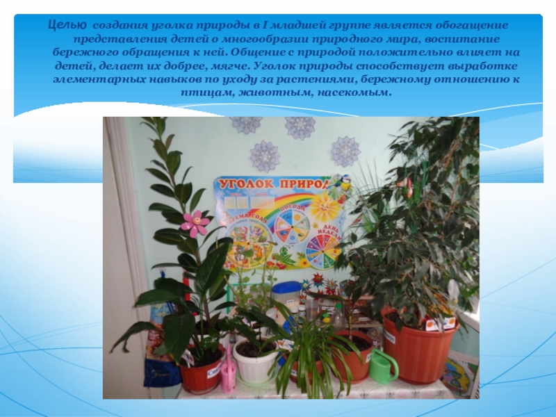 Слайд 4Целью создания уголка природы в I младшей группе является обогащение представления