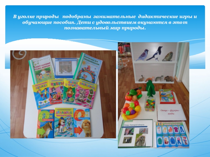 Слайд 5В уголке природы подобраны занимательные дидактические игры и обучающие пособия.