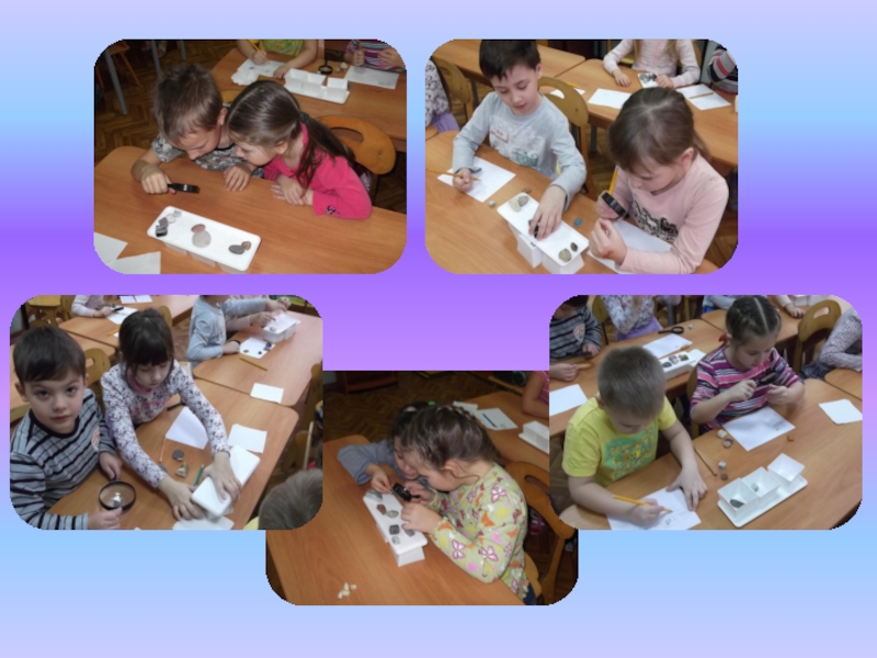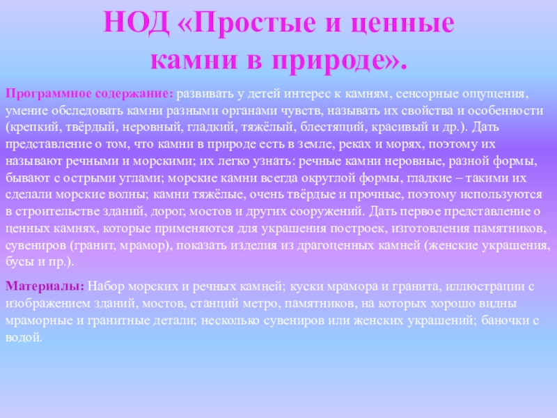 Материалы: Набор морских и речных камней; куски мрамора и гранита, иллюстрации с изображением зданий, мостов, станций метро, памятников, на которых хорошо видны мраморные и гранитные детали; несколько сувениров или женских украшений; баночки с водой.