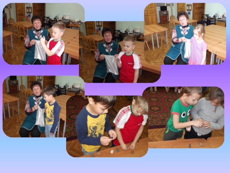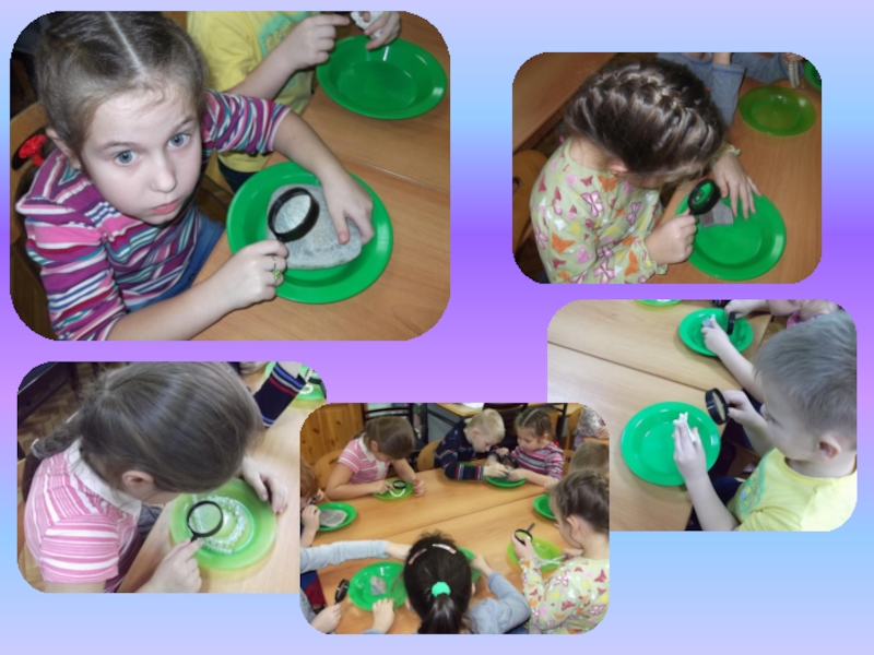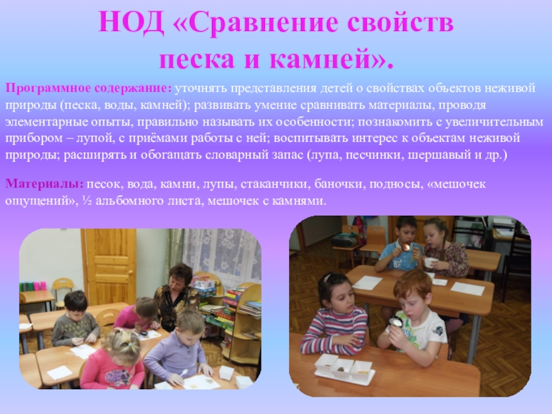 Материалы: песок, вода, камни, лупы, стаканчики, баночки, подносы, «мешочек ощущений», ½ альбомного листа, мешочек с камнями.