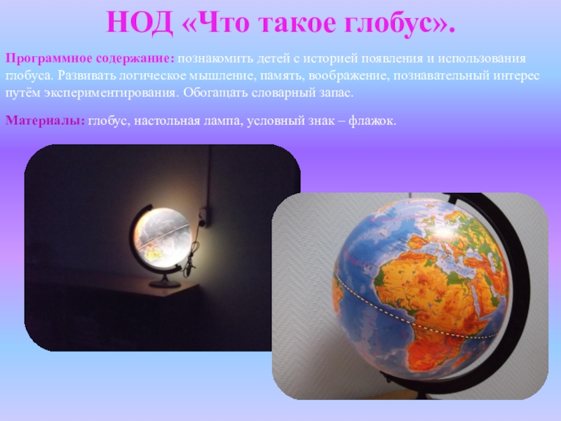 Материалы: глобус, настольная лампа, условный знак – флажок.