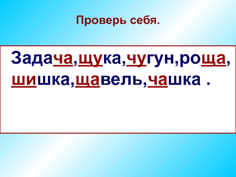 Проверь себя. Задача,щука,чугун,роща, шишка,щавель,чашка .