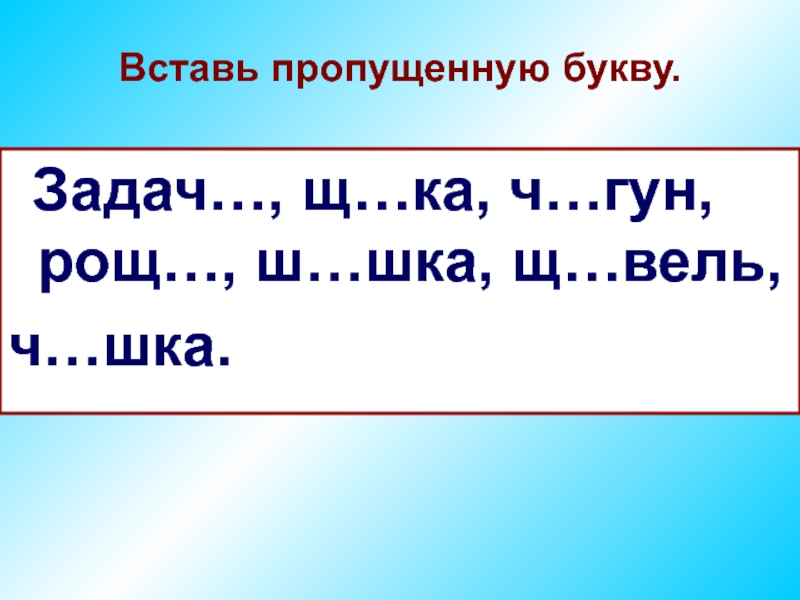 Задач…, щ…ка, ч…гун, рощ…, ш…шка, щ…вель,