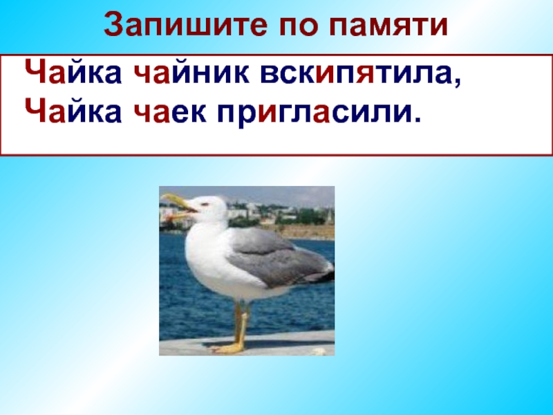 Запишите по памяти Чайка чайник вскипятила, Чайка чаек пригласили.