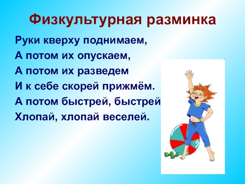 Физкультурная разминкаРуки кверху поднимаем,А потом их опускаем,А потом их разведемИ к себе скорей прижмём.А потом быстрей, быстрей,Хлопай,