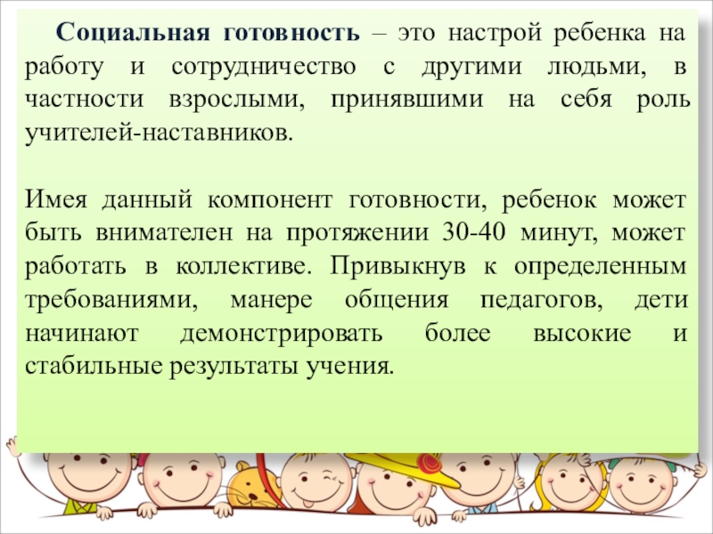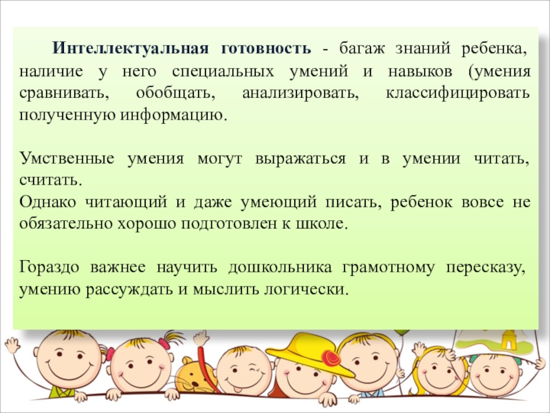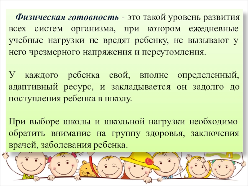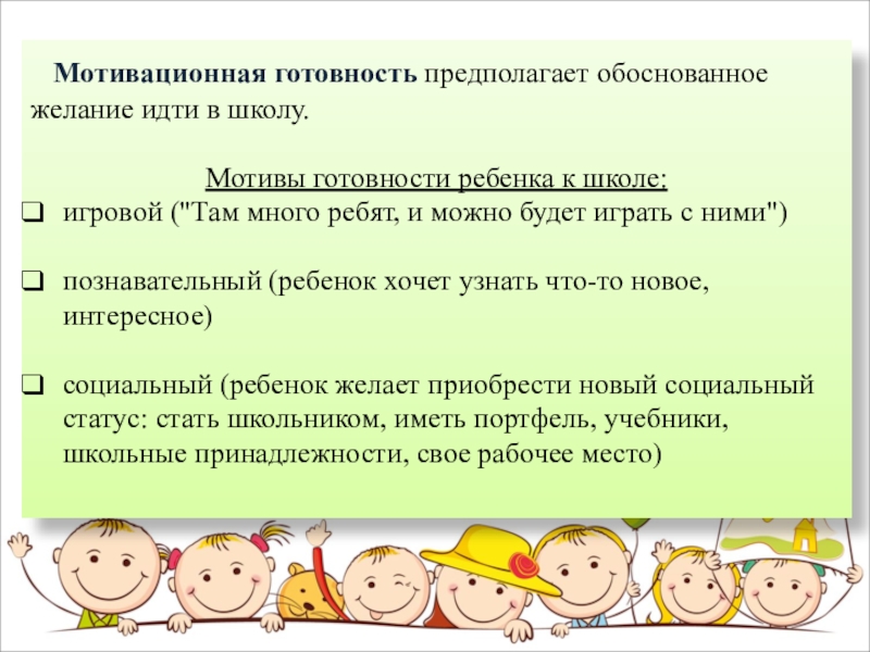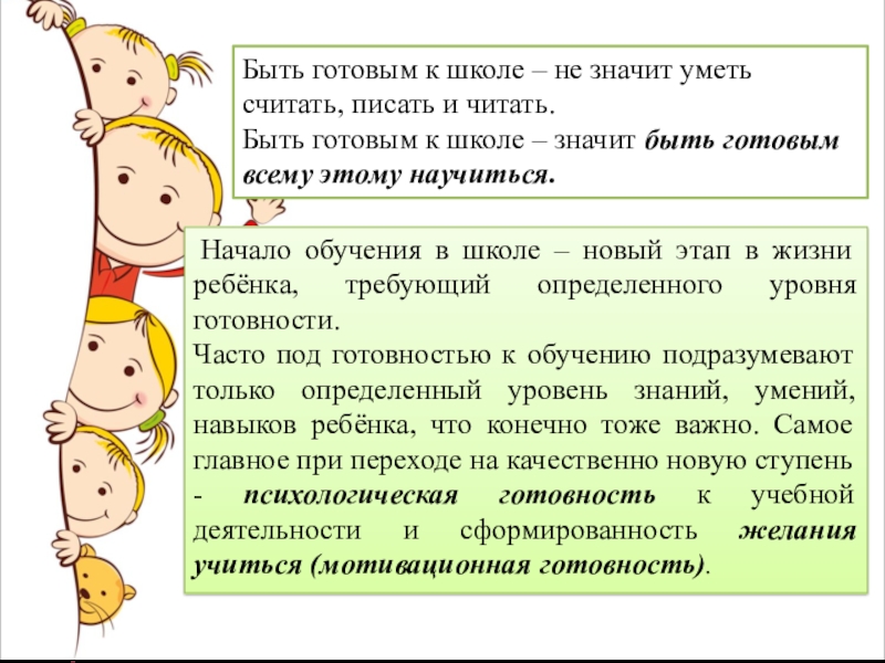 Часто под готовностью к обучению подразумевают только определенный уровень знаний, умений, навыков ребёнка, что конечно тоже важно. Самое главное при переходе на качественно новую ступень - психологическая готовность к учебной деятельности и сформированность желания учиться (мотивационная готовность).