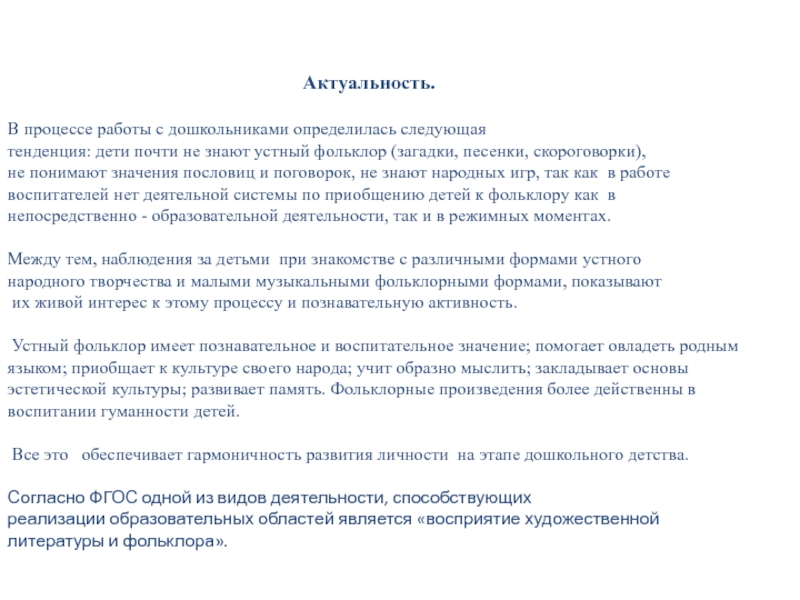 не понимают значения пословиц и поговорок, не знают народных игр, так как в работе воспитателей нет деятельной системы по приобщению детей к фольклору как в непосредственно - образовательной деятельности, так и в режимных моментах.