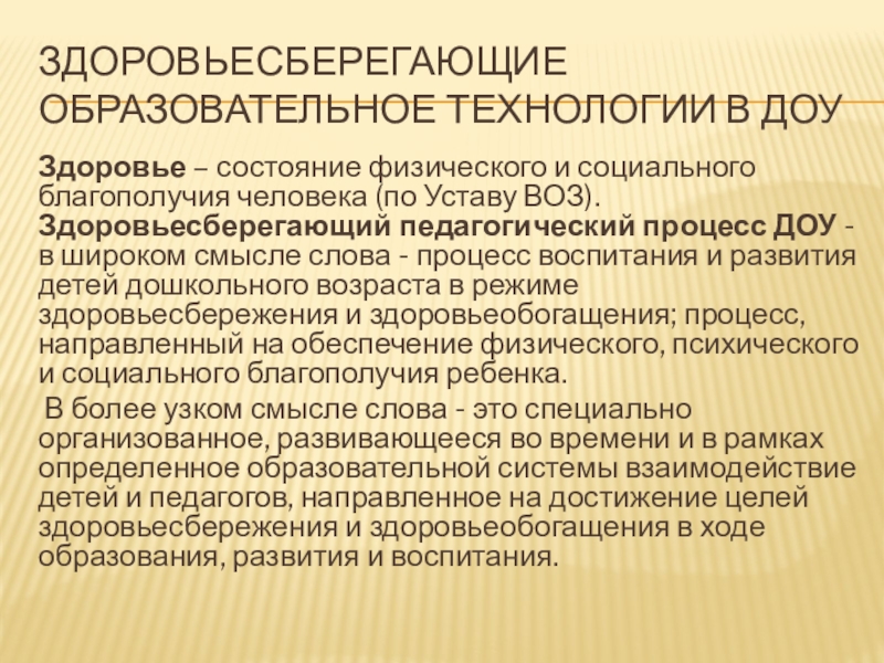 человека (по Уставу ВОЗ). Здоровьесберегающий педагогический процесс ДОУ - в широком смысле слова - процесс воспитания и развития детей дошкольного возраста в режиме здоровьесбережения и здоровьеобогащения; процесс, направленный на обеспечение физического, психического и социального благополучия ребенка.