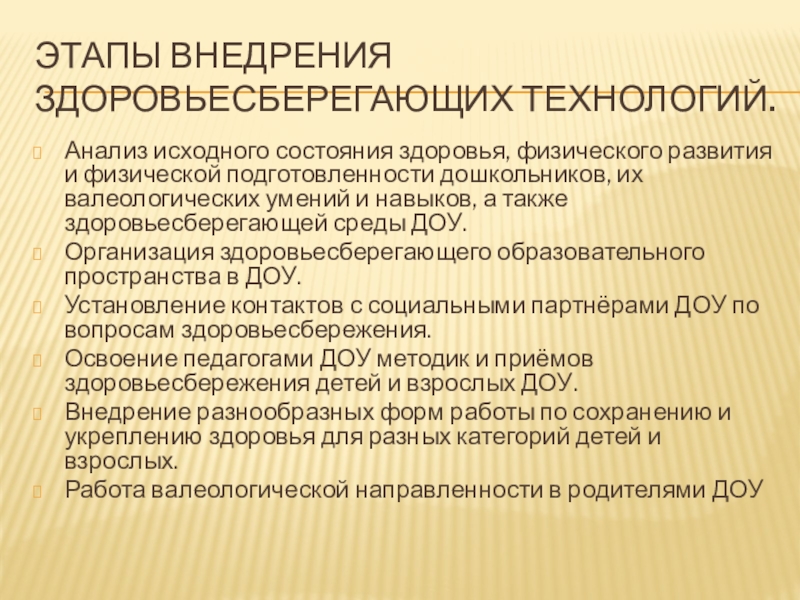Слайд 21Этапы внедрения здоровьесберегающих технологий.
