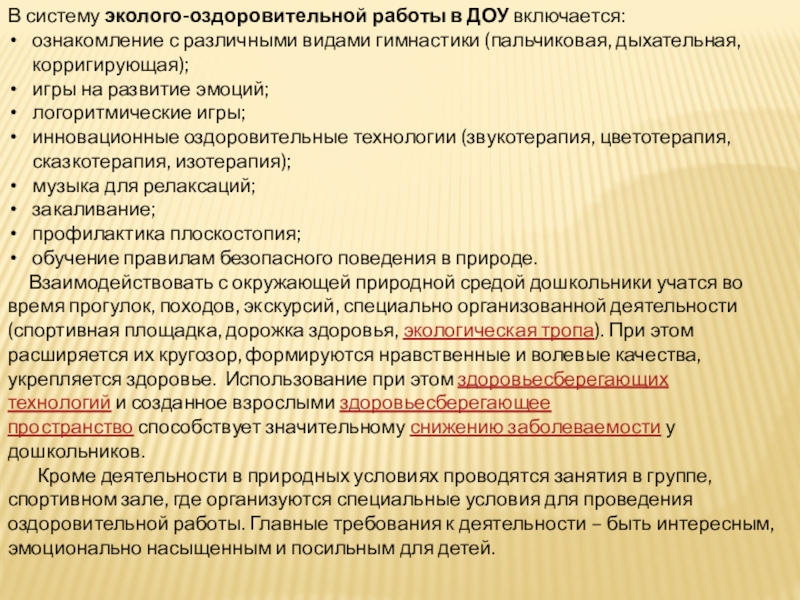 Слайд 27В систему эколого-оздоровительной работы в ДОУ включается: