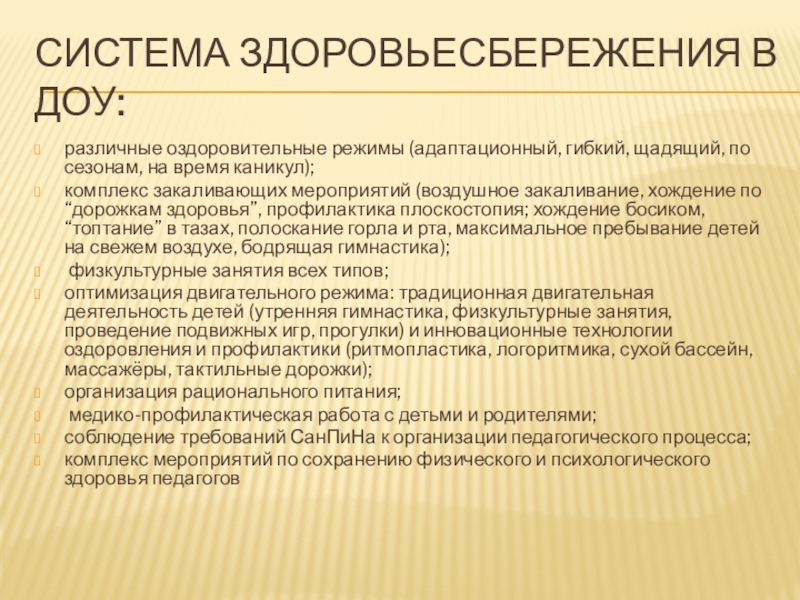комплекс закаливающих мероприятий (воздушное закаливание, хождение по “дорожкам здоровья”, профилактика плоскостопия; хождение босиком, “топтание” в тазах, полоскание горла и рта, максимальное пребывание детей на свежем воздухе, бодрящая гимнастика);