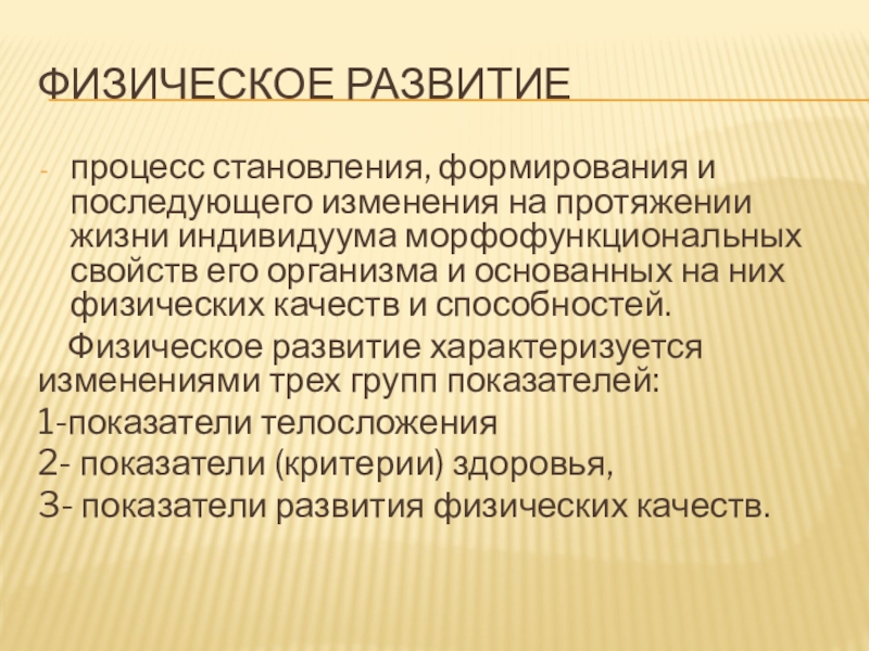 Физическое развитие характеризуется изменениями трех групп показателей: