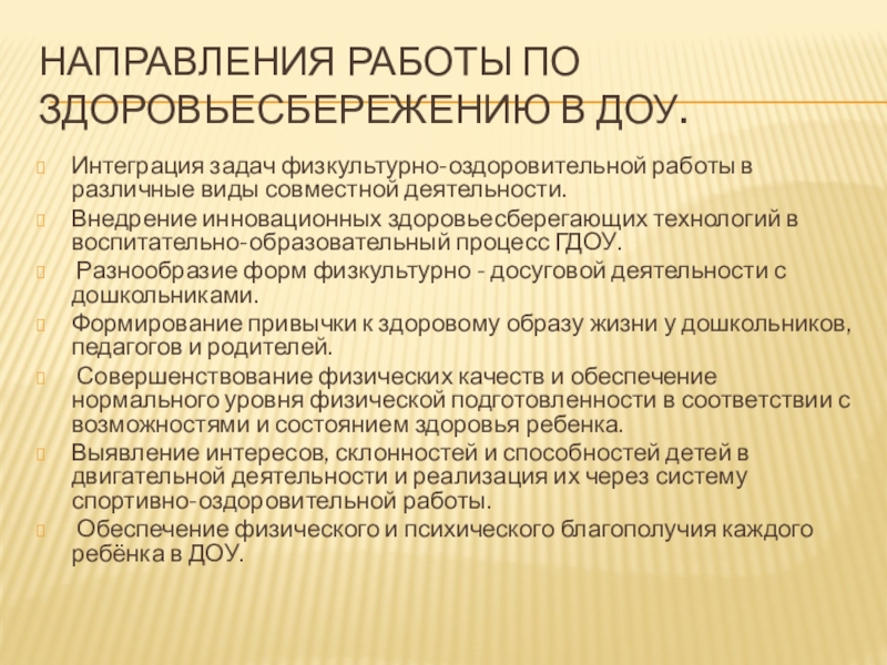 Внедрение разнообразных форм работы по сохранению и укреплению здоровья для разных категорий детей и взрослых.