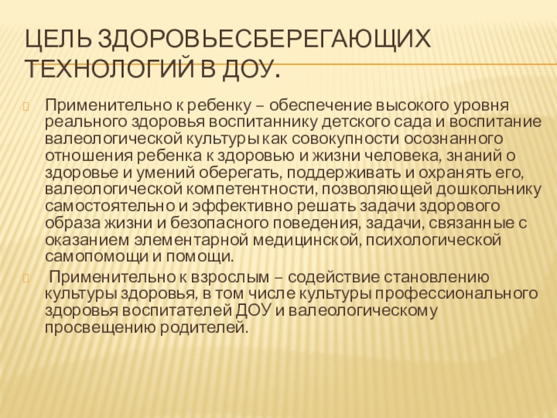 Применительно к взрослым – содействие становлению культуры здоровья, в том числе культуры профессионального здоровья воспитателей ДОУ и валеологическому просвещению родителей.