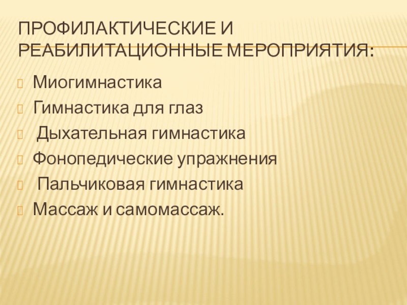 Слайд 14Профилактические и реабилитационные мероприятия: