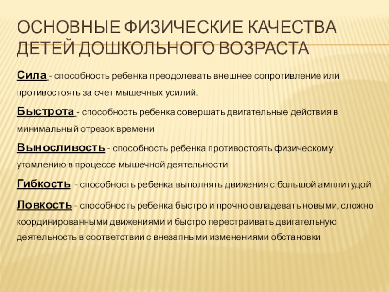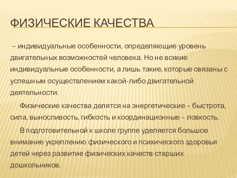 Физические качества делятся на энергетические – быстрота, сила, выносливость, гибкость и координационные – ловкость.