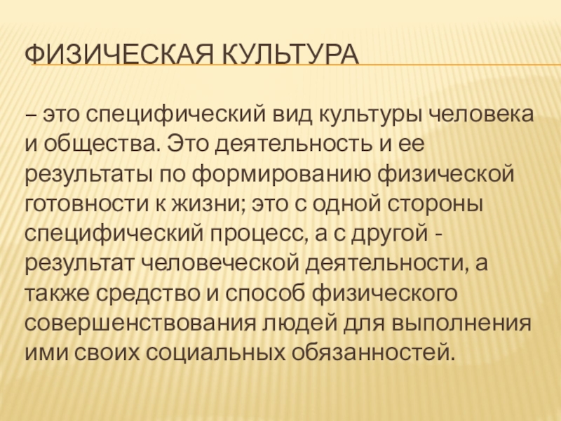 деятельность и ее результаты по формированию физической готовности к жизни; это с одной стороны специфический процесс, а с другой - результат человеческой деятельности, а также средство и способ физического совершенствования людей для выполнения ими своих социальных обязанностей.