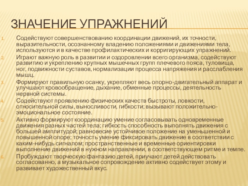 Играют важную роль в развитии и оздоровлении всего организма, содействуют развитию и укреплению крупных мышечных групп плечевого пояса, туловища, ног, подвижности суставов, нормализации процесса напряжения и расслабления мышц.
