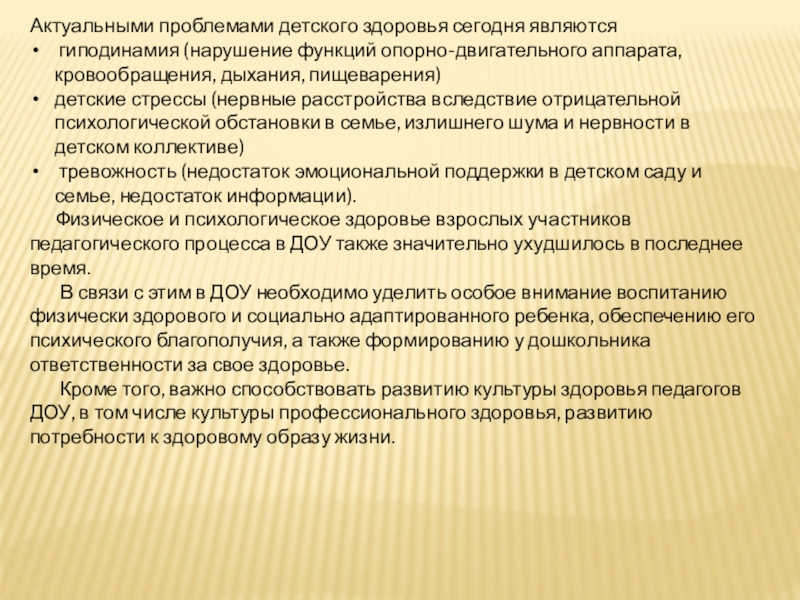 Физическое и психологическое здоровье взрослых участников педагогического процесса в ДОУ также значительно ухудшилось в последнее время.
