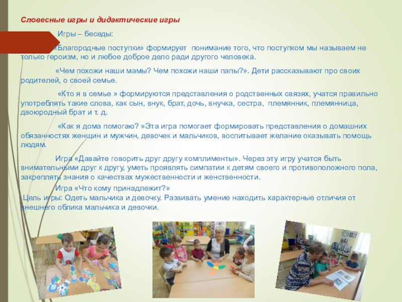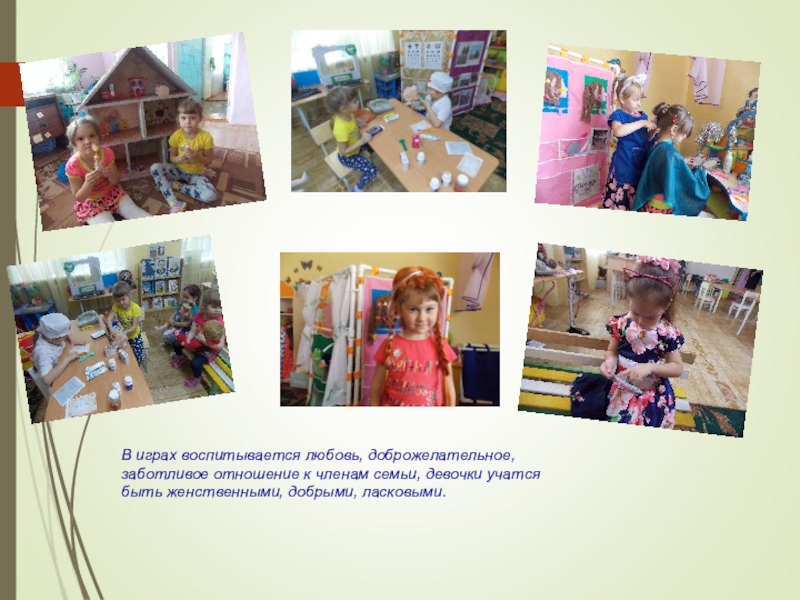 Слайд 10В играх воспитывается любовь, доброжелательное, заботливое отношение к членам семьи, девочки