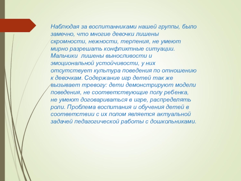 Социальные изменения, происходящие в современном обществе, привели к разрушению традиционных стереотипов мужского и женского поведения. Отсутствие дифференцированного подхода к мальчикам и девочкам, сказывается на поведении и поступках детей.