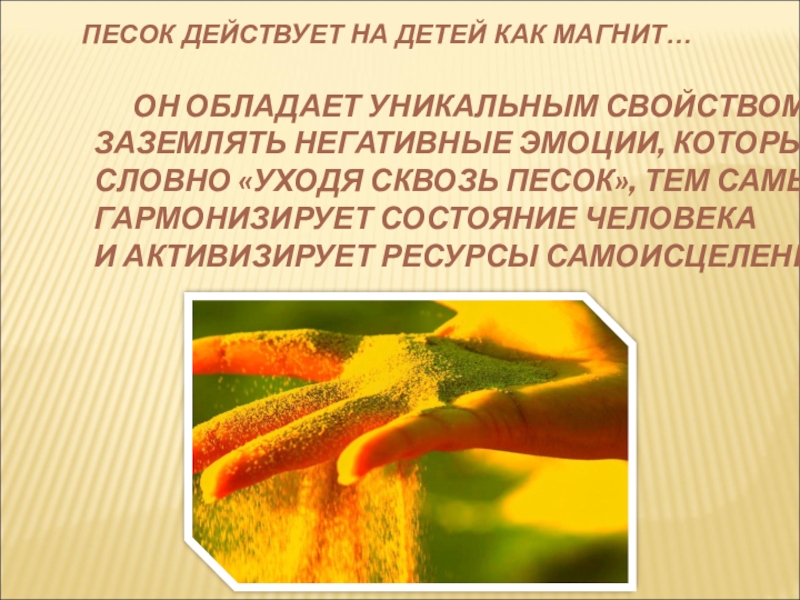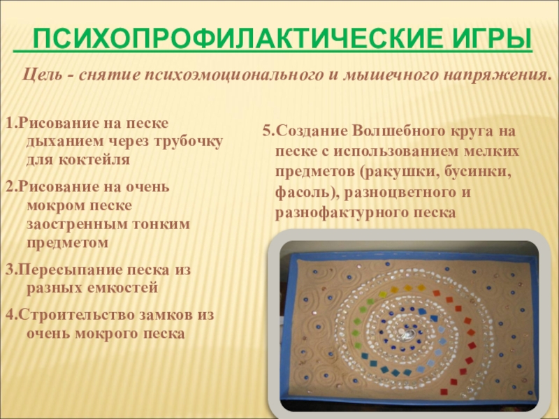 5.Создание Волшебного круга на песке с использованием мелких предметов (ракушки, бусинки, фасоль), разноцветного и разнофактурного песка