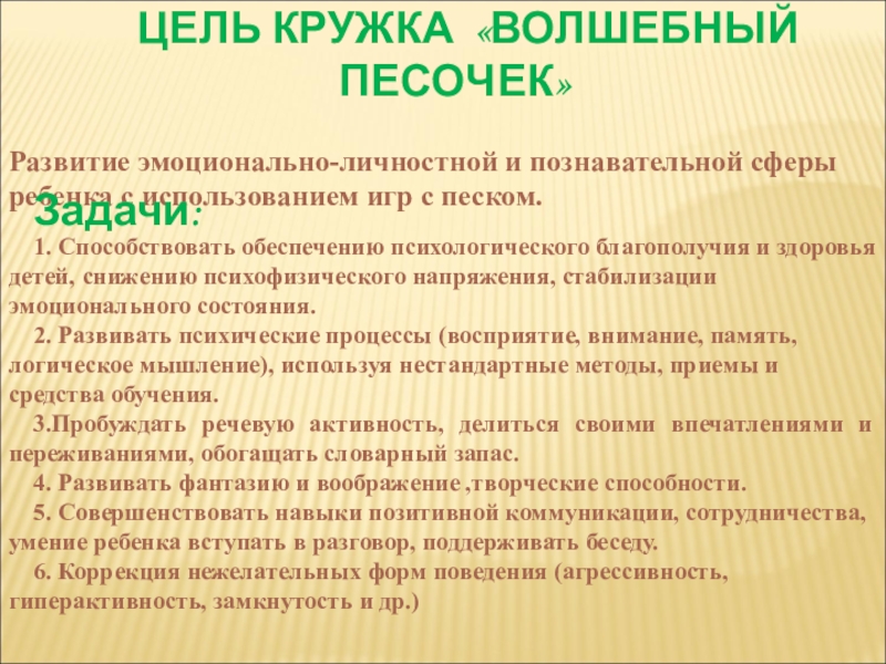 1. Способствовать обеспечению психологического благополучия и здоровья детей, снижению психофизического напряжения, стабилизации эмоционального состояния.