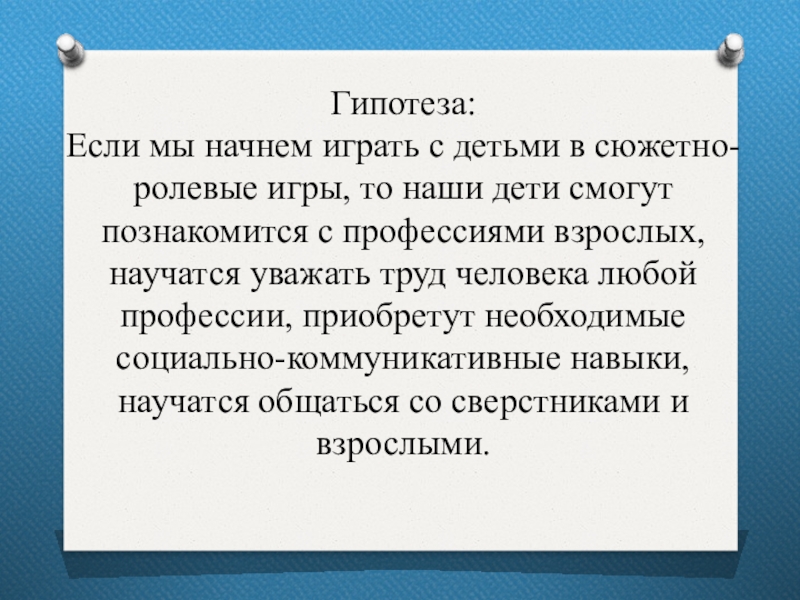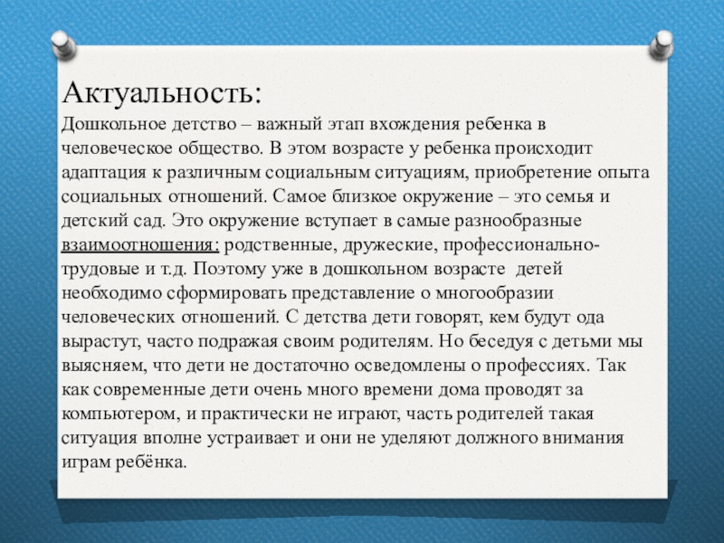этом возрасте у ребенка происходит адаптация к различным социальным ситуациям, приобретение опыта социальных отношений. Самое близкое окружение – это семья и детский сад. Это окружение вступает в самые разнообразные взаимоотношения: родственные, дружеские, профессионально-трудовые и т.д. Поэтому уже в дошкольном возрасте детей необходимо сформировать представление о многообразии человеческих отношений. С детства дети говорят, кем будут ода вырастут, часто подражая своим родителям. Но беседуя с детьми мы выясняем, что дети не достаточно осведомлены о профессиях. Так как современные дети очень много времени дома проводят за компьютером, и практически не играют, часть родителей такая ситуация вполне устраивает и они не уделяют должного внимания играм ребёнка.