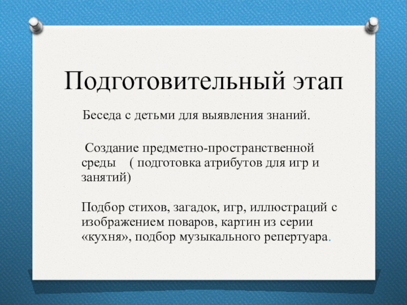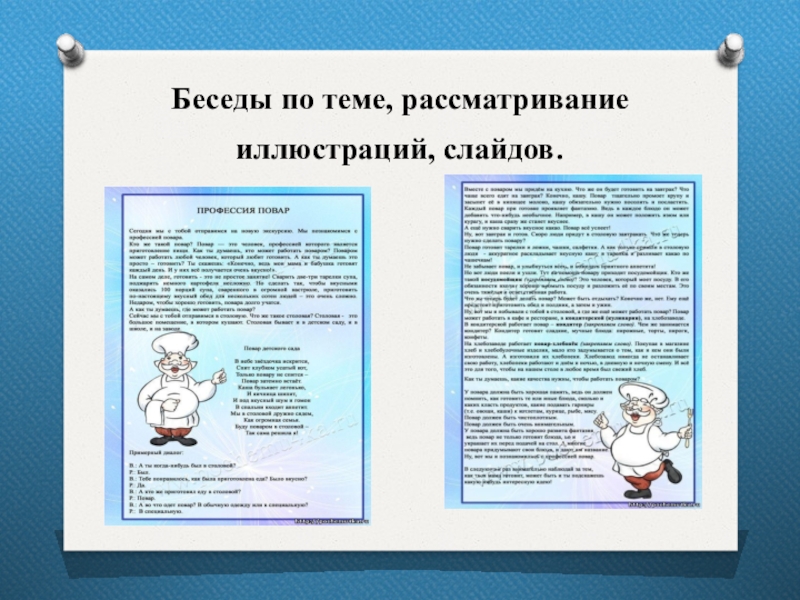 Подбор стихов, загадок, игр, иллюстраций с изображением поваров, картин из серии «кухня», подбор музыкального репертуара.