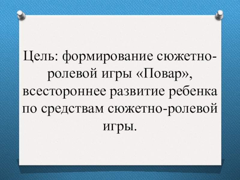 Слайд 2Цель: формирование сюжетно-ролевой игры «Повар», всестороннее развитие ребенка по средствам сюжетно-ролевой