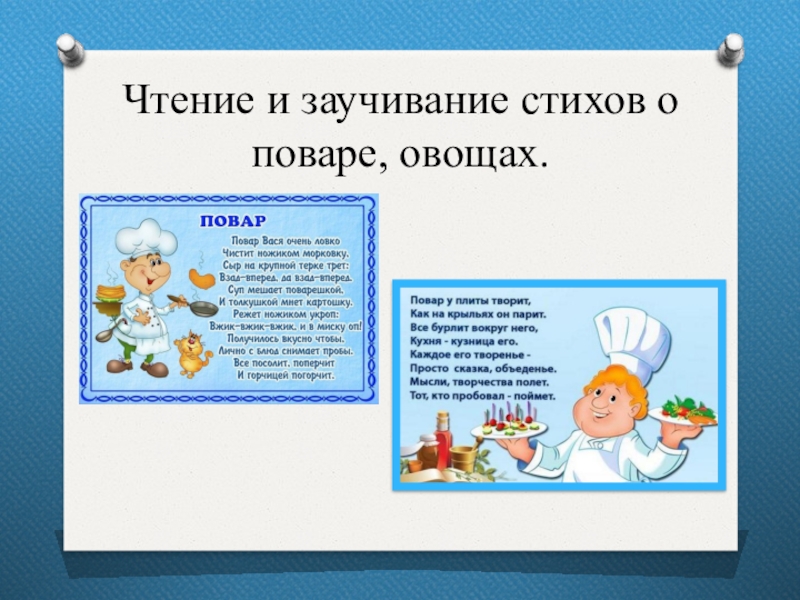 Слайд 18Чтение и заучивание стихов о поваре, овощах.