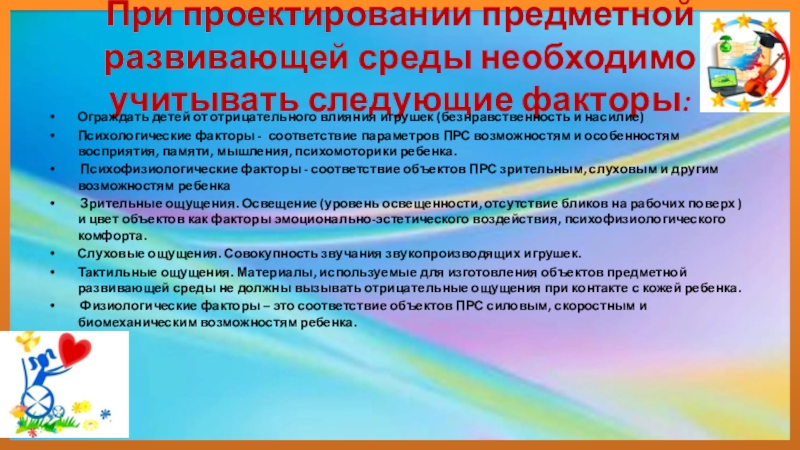 Слайд 9При проектировании предметной развивающей среды необходимо учитывать следующие факторы: