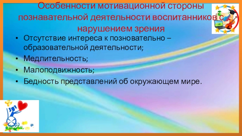 Слайд 12Особенности мотивационной стороны познавательной деятельности воспитанников с нарушением зрения