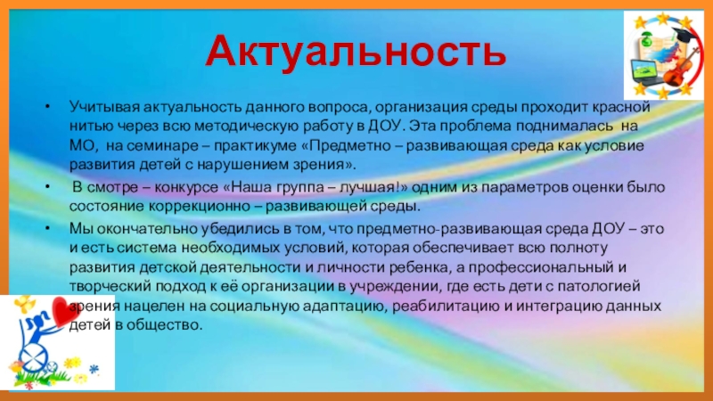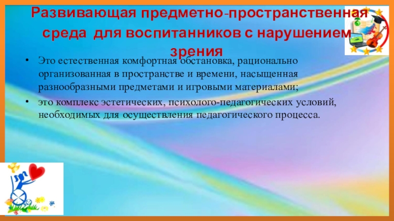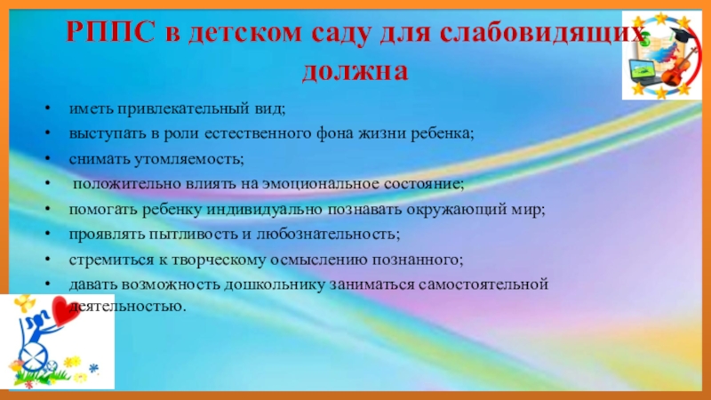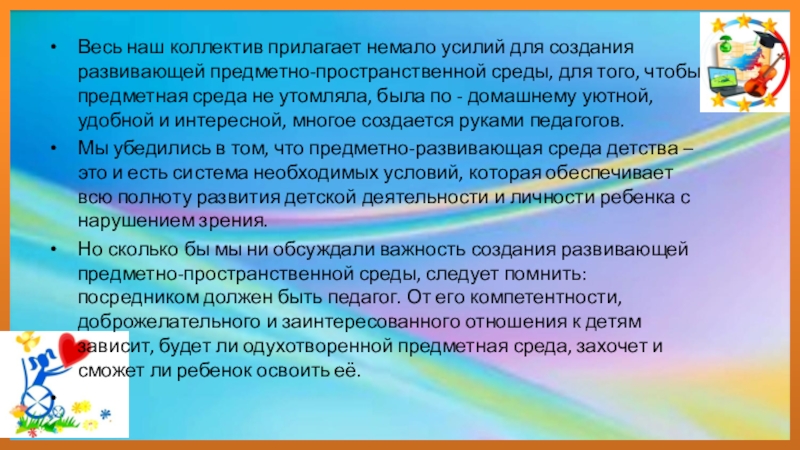Мы убедились в том, что предметно-развивающая среда детства – это и есть система необходимых условий, которая обеспечивает всю полноту развития детской деятельности и личности ребенка с нарушением зрения.