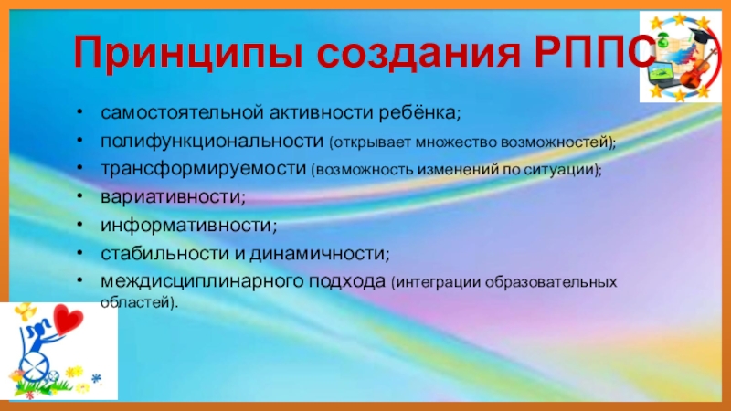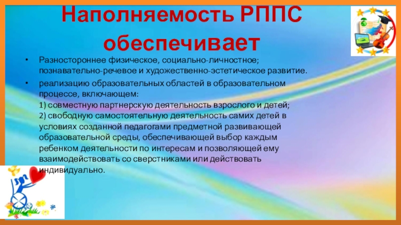обстановка, рационально организованная в пространстве и времени, насыщенная разнообразными предметами и игровыми материалами;