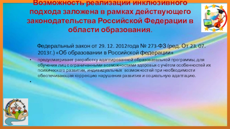 Слайд 4Возможность реализации инклюзивного подхода заложена в рамках действующего законодательства Российской Федерации