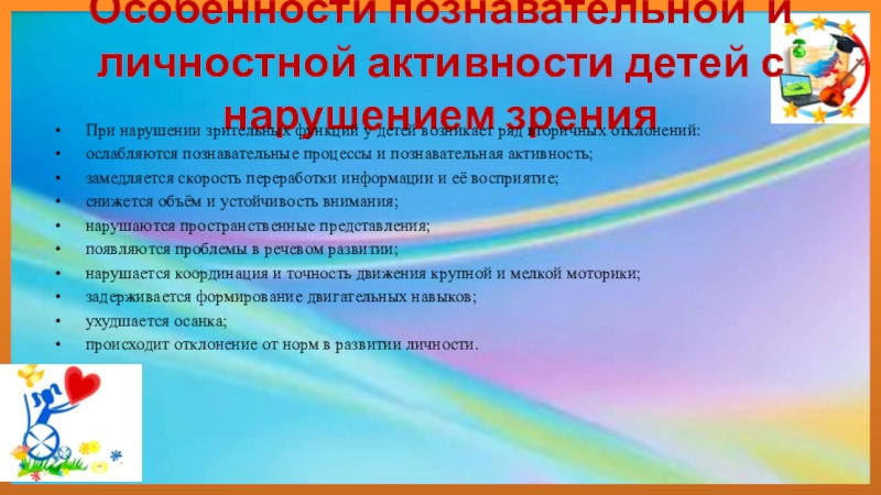 Слайд 11Особенности познавательной и личностной активности детей с нарушением зрения