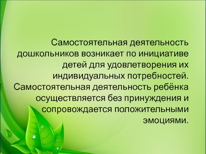 Слайд 20Самостоятельная деятельность дошкольников возникает по инициативе детей для удовлетворения их индивидуальных